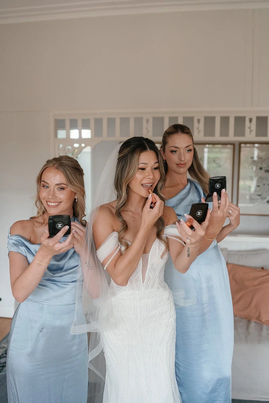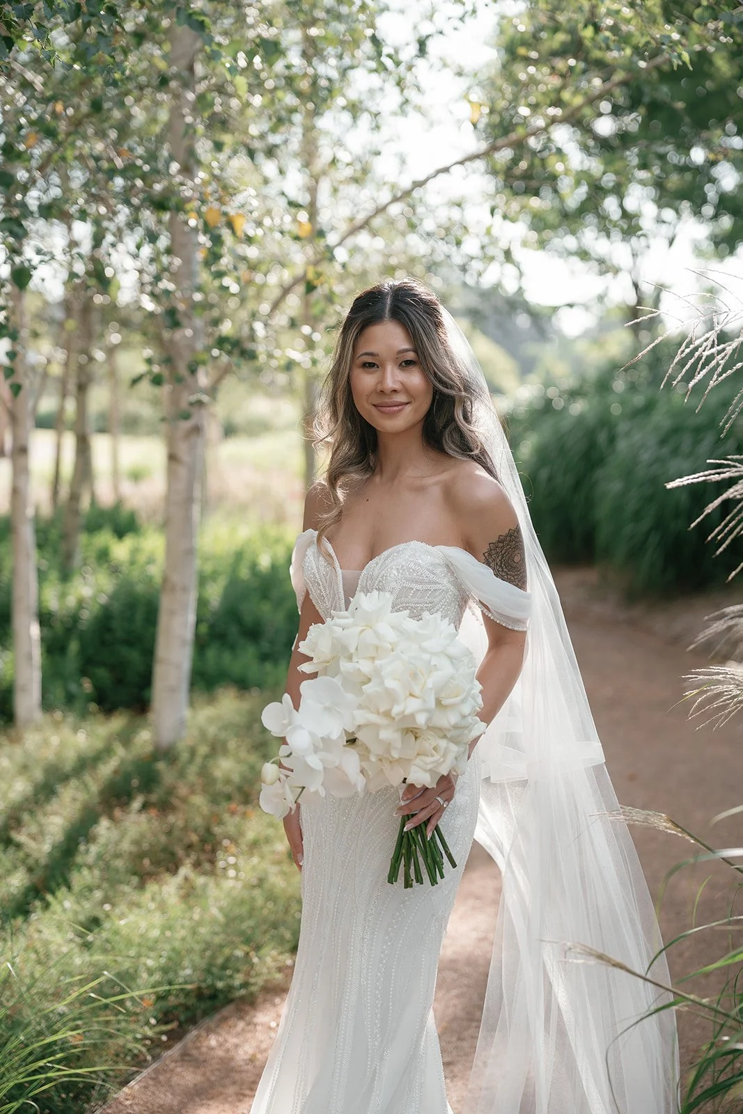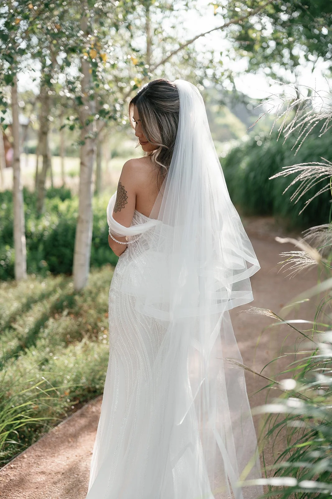 Simone’s hair was styled into a romantic half up-style with a textured bun, by adding face framing pieces and waves softens the overall look. Her makeup featured, natural, bronze and neutral tones to enhance her effortless beauty.